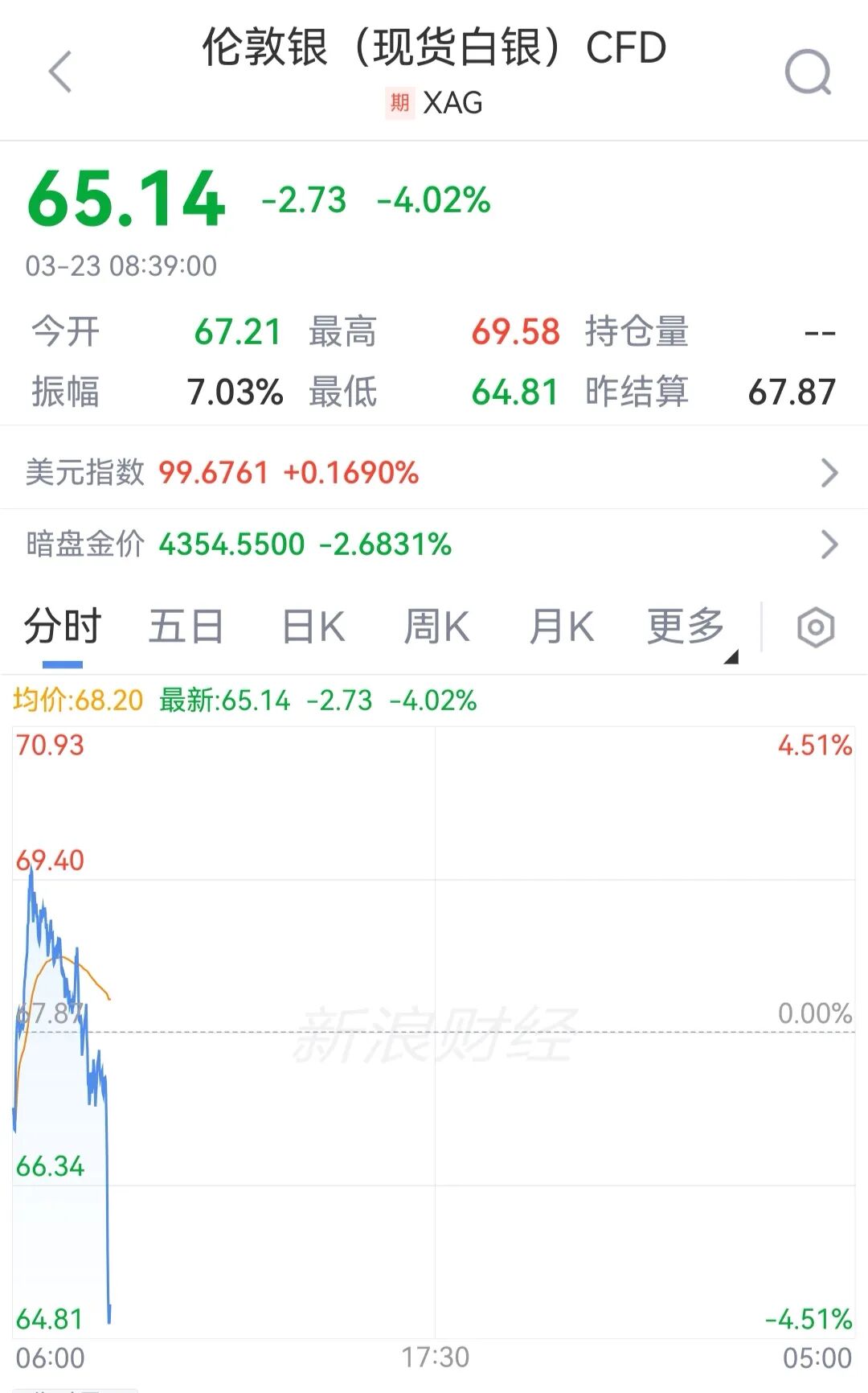 3月23日,现货黄金向下跌破4350美元,现报4337.97美元/盎司,日内跌3.54%。现货白银报65.14美元/盎司,日内跌4.02%。
