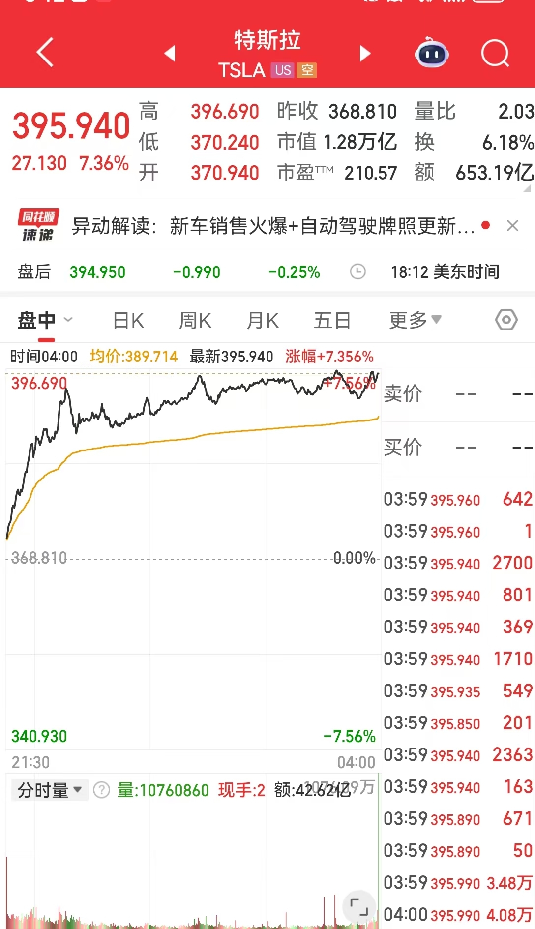 特斯拉报395.94美元,涨7.36%,市值1.28万亿美元。值得注意的是,特斯拉股价最近两日已累涨逾13.8%,2个交易日市值累计增加1553亿美元(约合人民币11064亿元)。