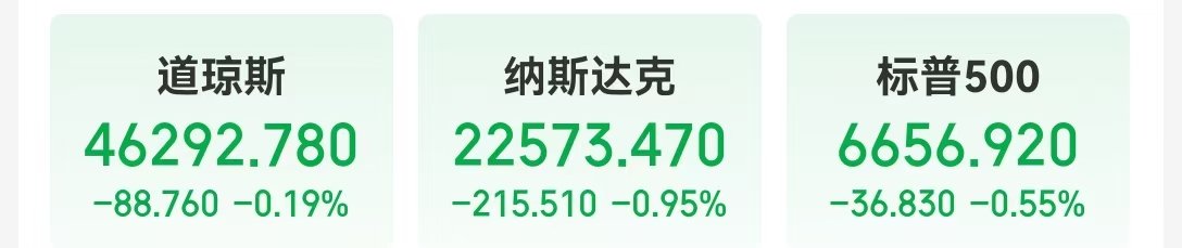 大型科技股普遍下跌,甲骨文跌超4%;亚马逊跌超3%;英伟达跌超2%,市值一夜蒸发1259亿美元(约合人民币8954亿元);特斯拉、微软跌超1%。