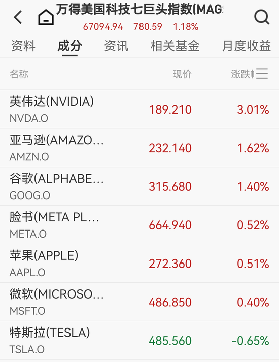 大型科技股多数上涨,万得美国科技七巨头指数涨1.18%。英伟达涨超3%,市值一夜增加1341亿美元(约合人民币9425亿元)。