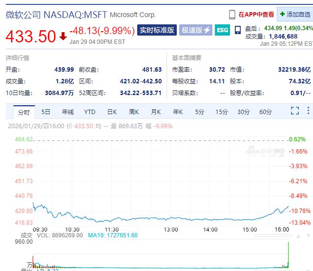 图片来源:每经媒资库微软下跌9.99%,市值蒸发3577亿美元(约合人民币24854亿元),成为有记录以来第二大的单日市值损失。这一消息重新点燃了市场对硅谷在AI基础设施上巨额投资的担忧情绪,并拖累华尔街整体走低。